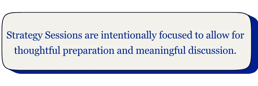 Strategy Sessions are designed to focus on one primary question. Broader planning is best handled through comprehensive engagement.